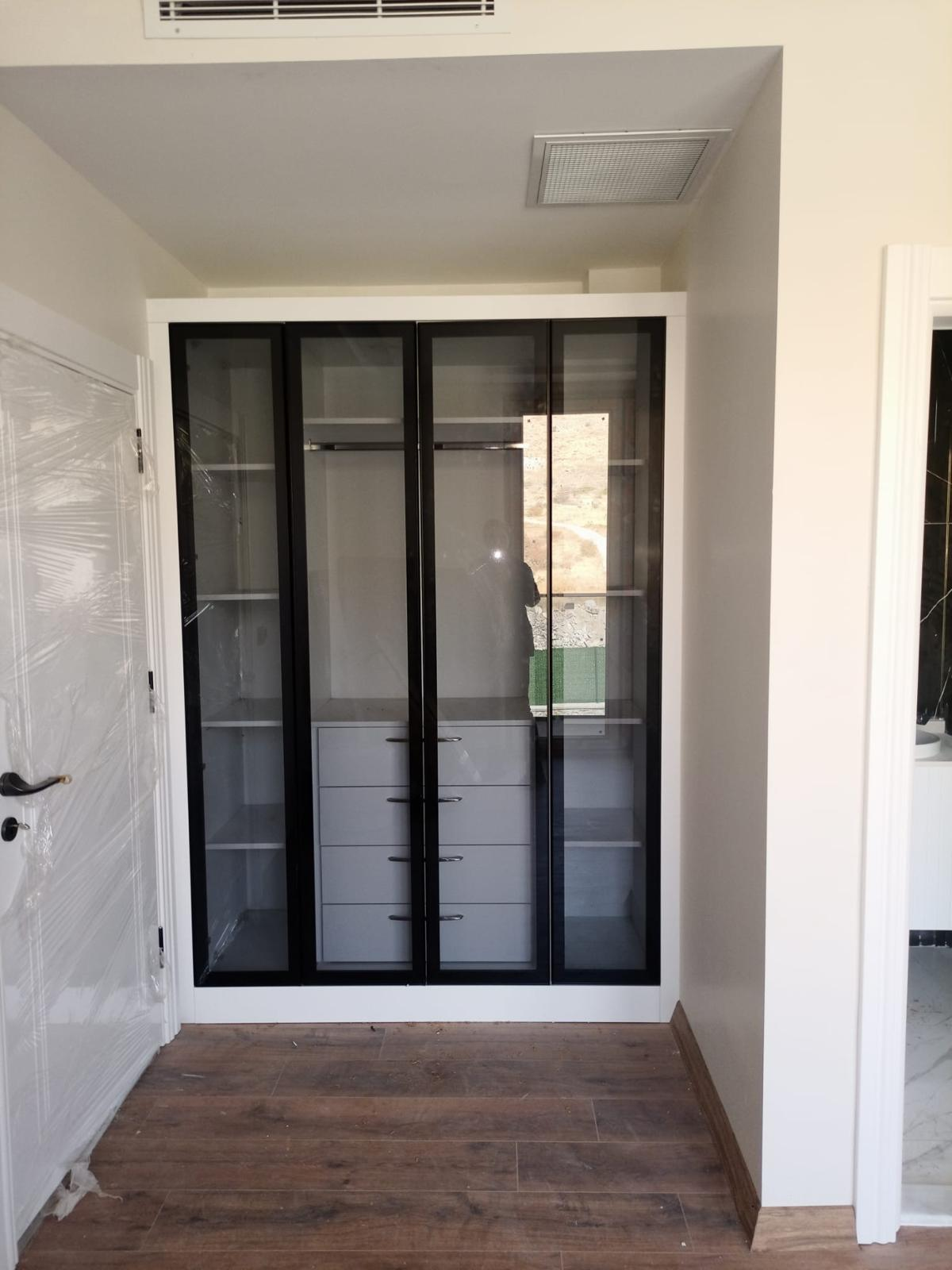 Sleek, floor-to-ceiling custom wardrobes featuring matte black aluminum frames and smoke-tinted glass doors. These bespoke units offer a high-end "boutique" feel with integrated drawer stacks and adjustable shelving for ultimate organization. A perfect luxury storage solution that combines visibility with a clean, sophisticated profile.