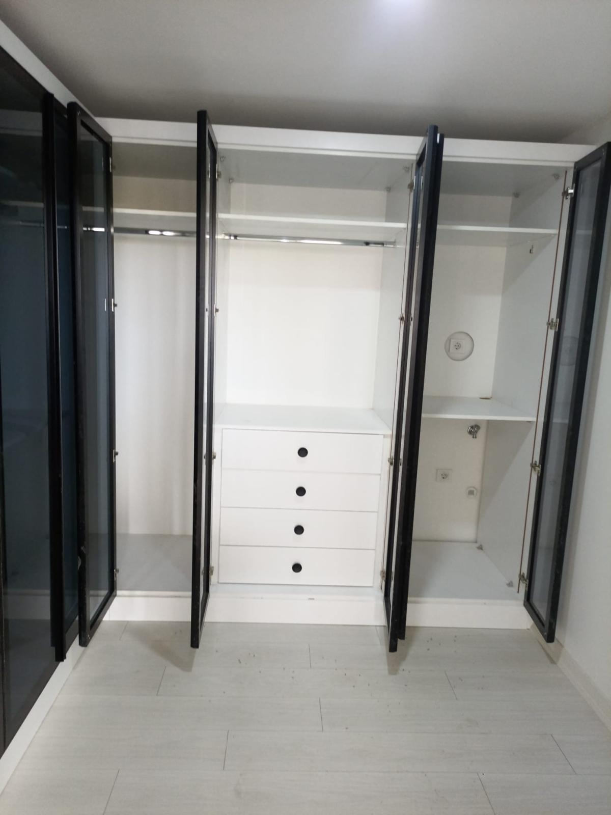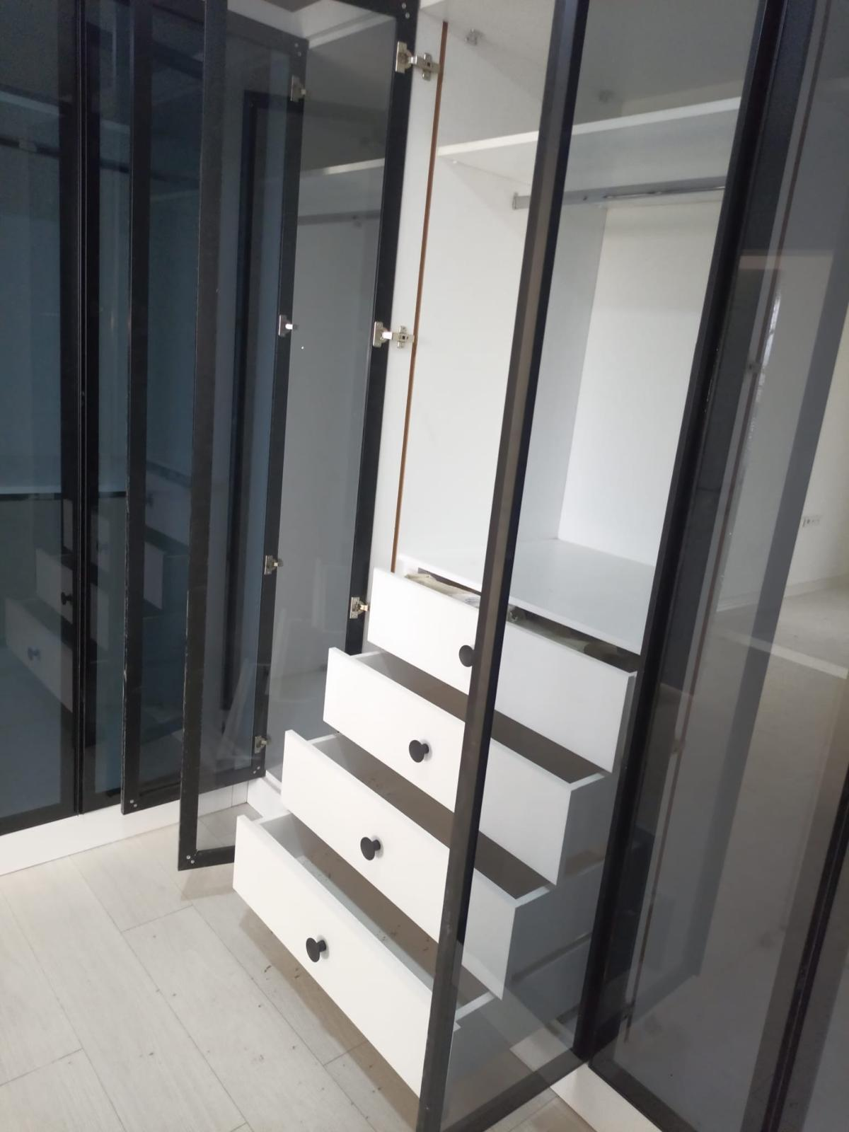 A premium L-shaped closet system featuring sleek black aluminum-framed glass doors and a crisp white interior. This custom corner unit includes integrated LED-ready shelving, polished chrome hanging rods, and a soft-close four-drawer stack with minimalist hardware. Designed to maximize corner space in a Tampa residence, this system combines high-visibility boutique styling with efficient, modern organization.