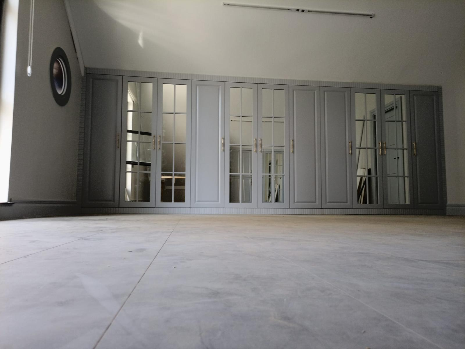 An expansive, wall-to-wall custom closet system featuring integrated mirrored doors with elegant mullion detailing. This bespoke storage solution is finished in a soft dove grey with premium gold hardware, designed to reflect light and expand the feel of the room. The precision-fit installation follows the architectural lines of the space, offering a high-capacity, luxury "walk-in" experience in a reach-in format.