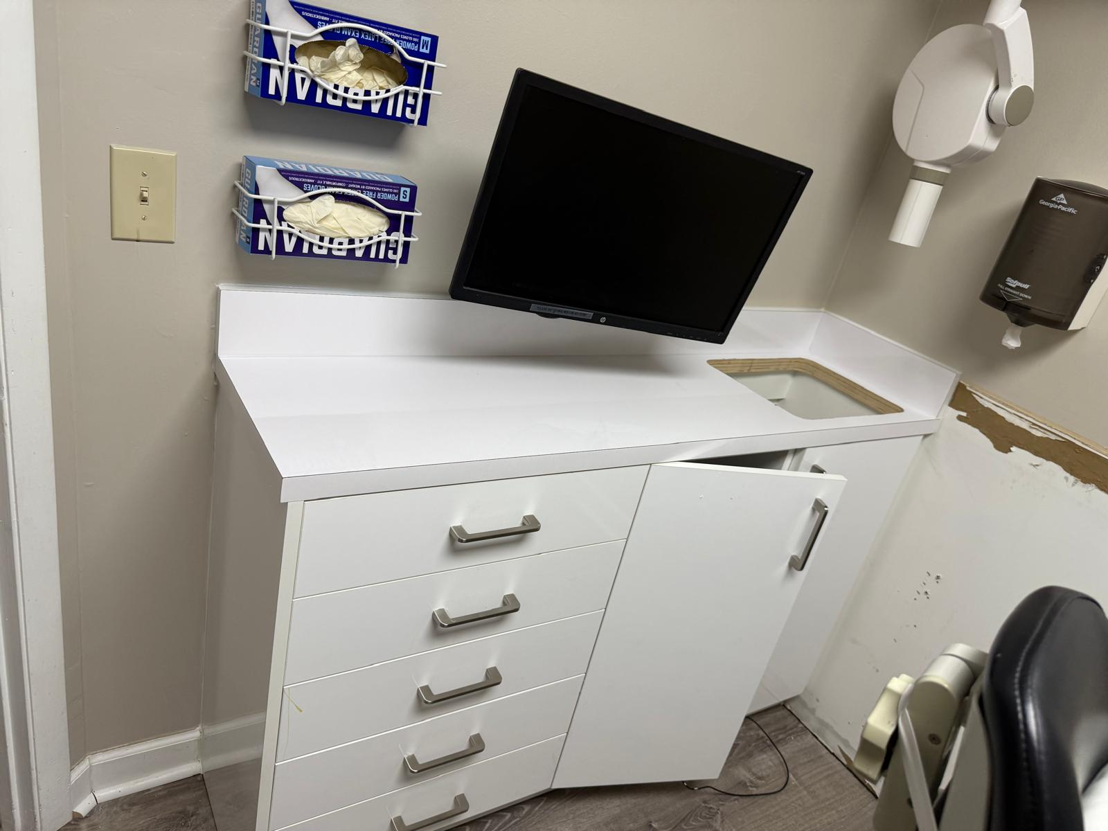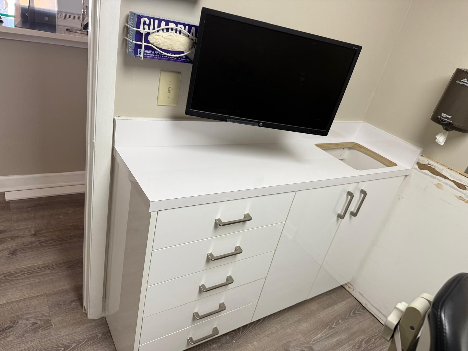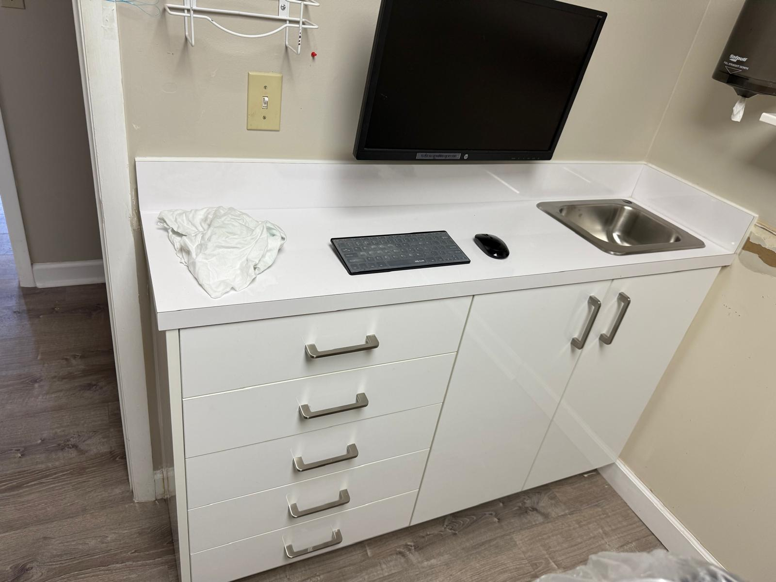 Custom medical cabinetry designed for clinical efficiency, featuring a high-gloss white laminate finish and antimicrobial solid-surface countertops. This integrated workstation includes a specialized deep-drawer stack for organized medical supplies and a seamless drop-in stainless steel surgical sink. Engineered for a Tampa healthcare facility, the design emphasizes hygiene, durability, and a streamlined footprint for optimized patient care areas.