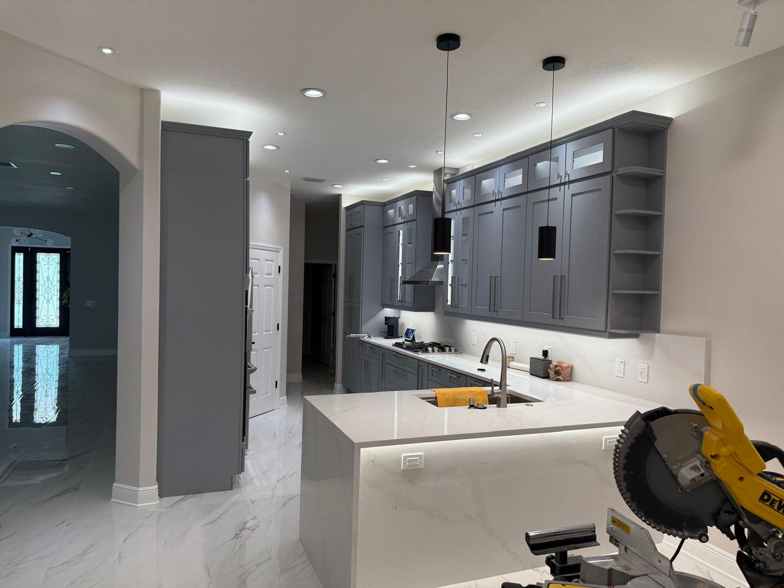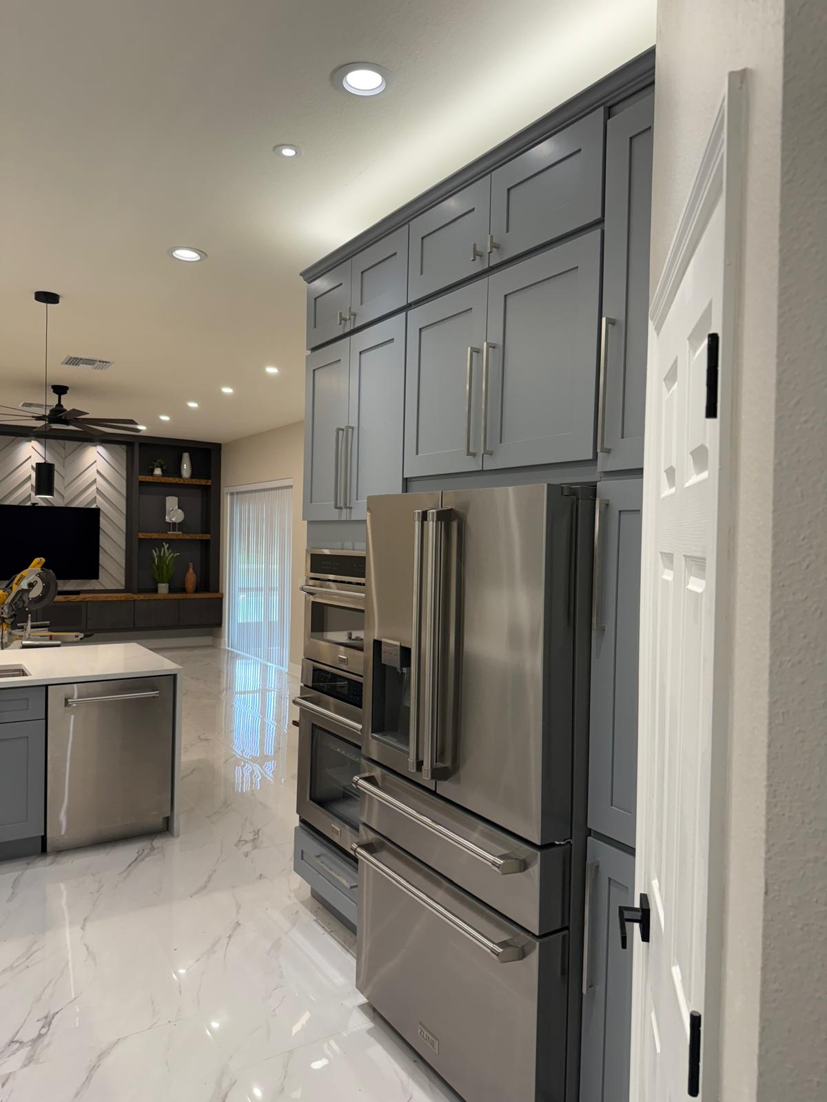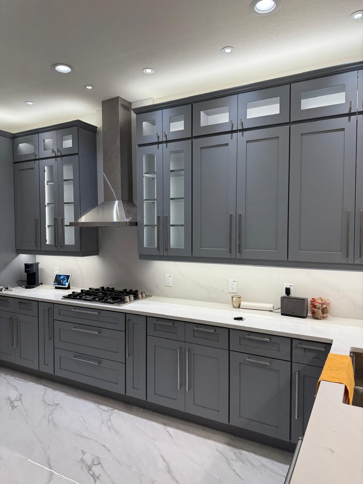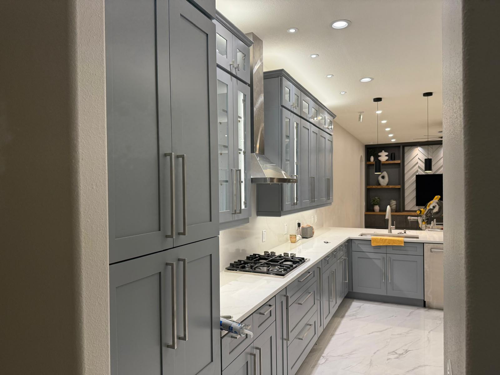 This comprehensive kitchen remodel features custom Shaker-style cabinetry finished in a sophisticated slate blue, accented by sleek brushed nickel hardware. The design is anchored by a dramatic waterfall-edge quartz island and matching full-height backsplash, illuminated by custom integrated under-cabinet and toe-kick lighting. Functional highlights include floor-to-ceiling pantry storage, glass-front display uppers, and a high-performance chef’s station with a stainless steel range hood.