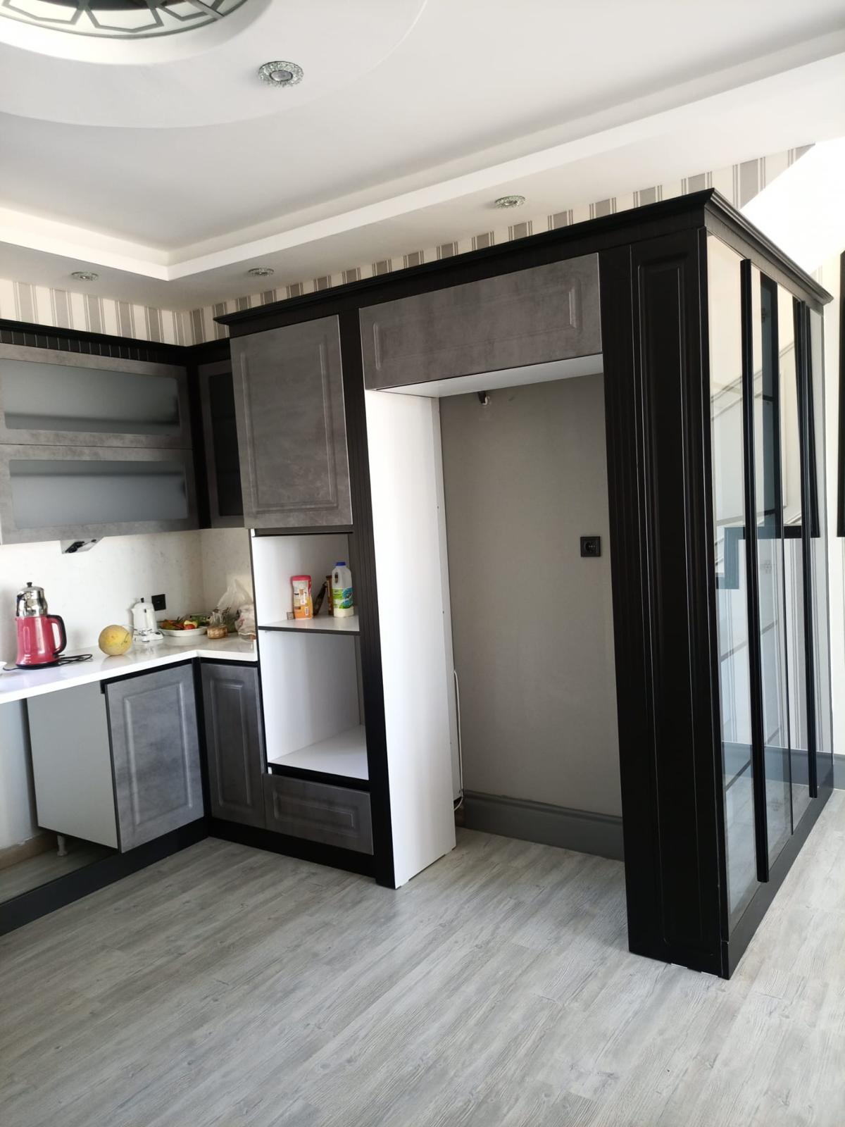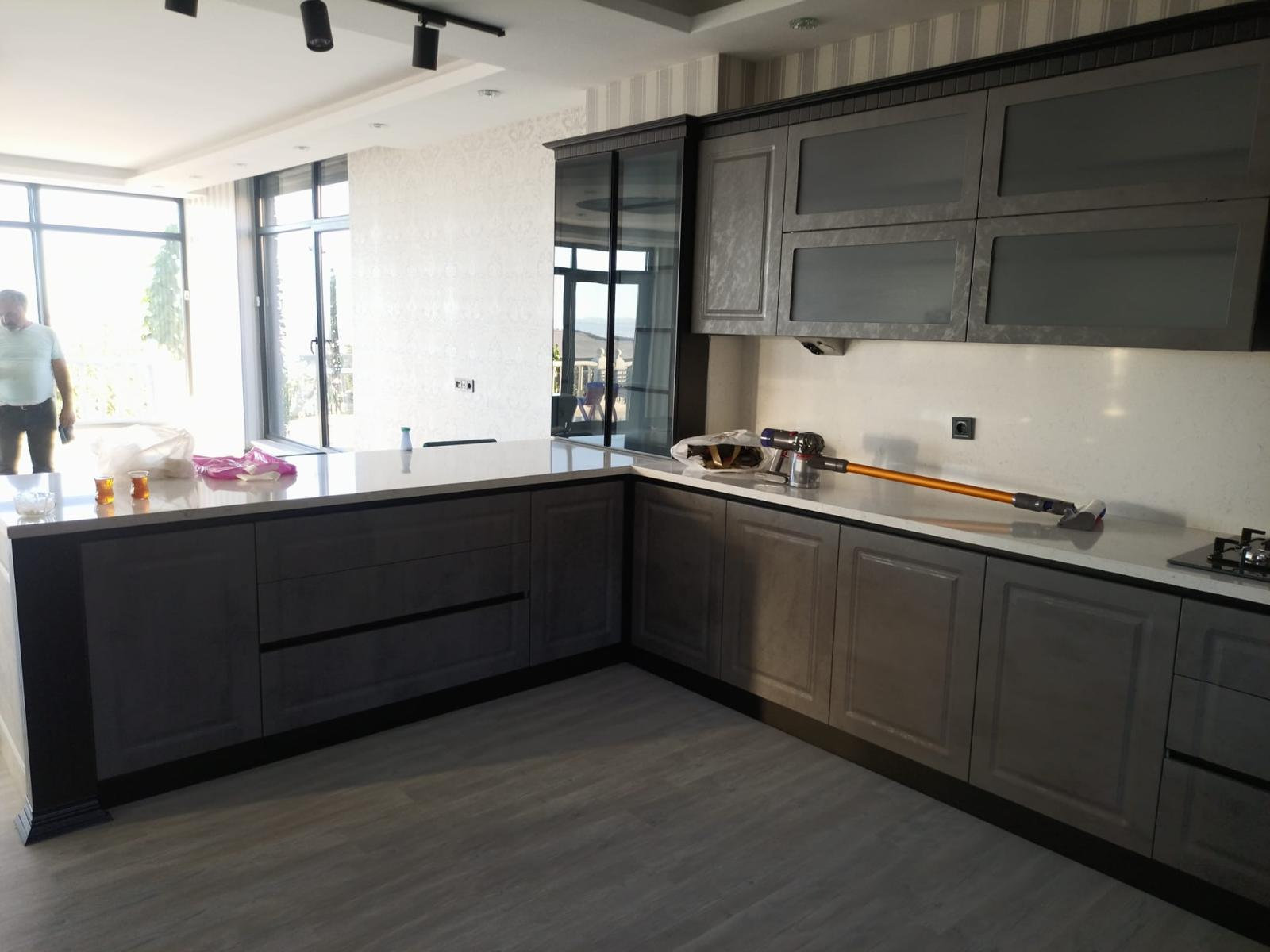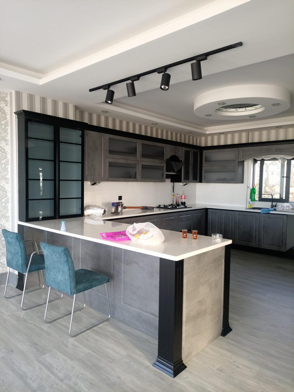 A bold, modern kitchen featuring textured concrete-finish cabinetry paired with deep matte black framing. This design includes a spacious waterfall-edge peninsula, integrated track lighting, and frosted glass uppers for a clean, industrial aesthetic. Engineered for the modern Tampa home, it maximizes storage with a floor-to-ceiling pantry and seamless appliance integration.