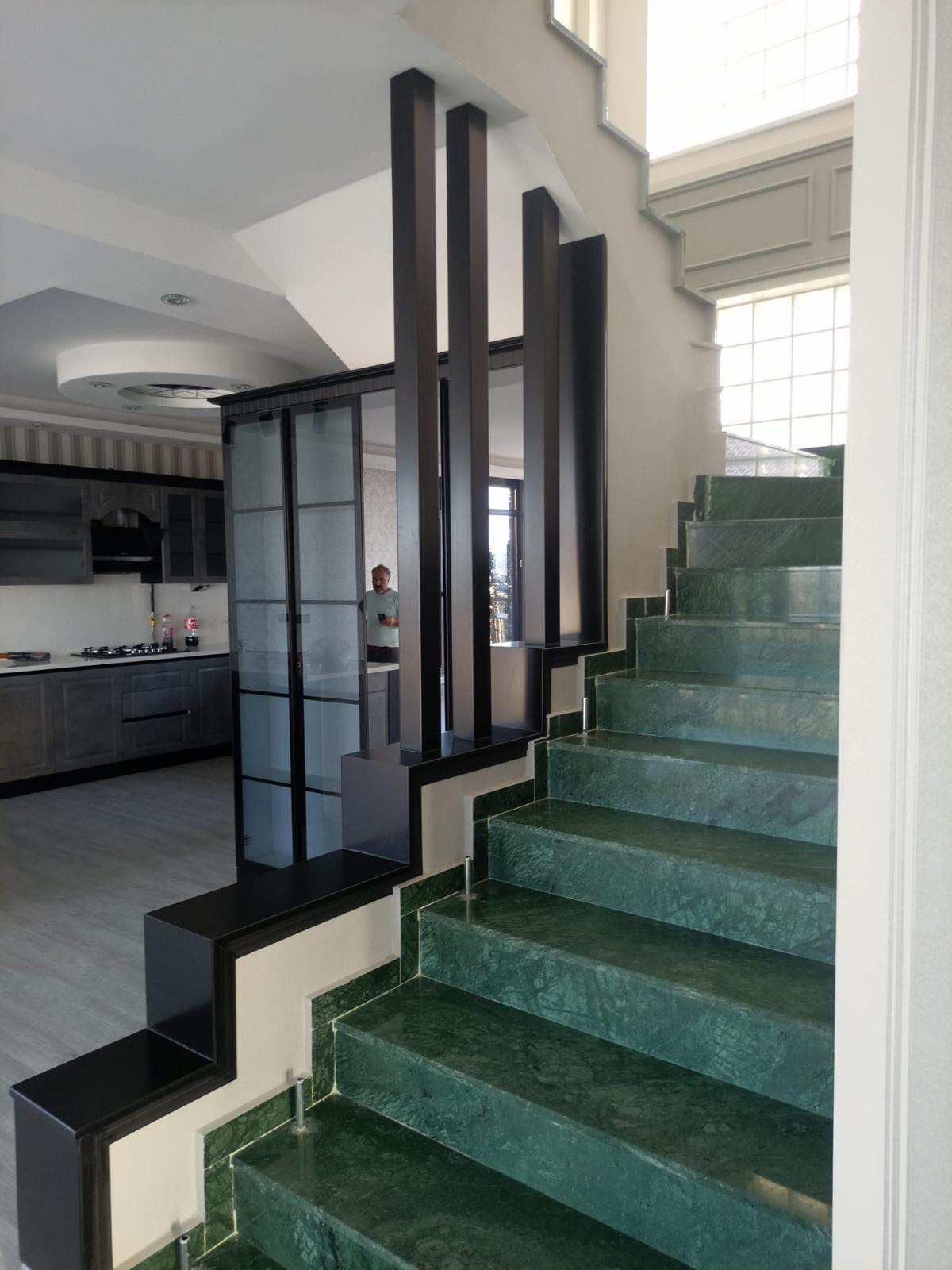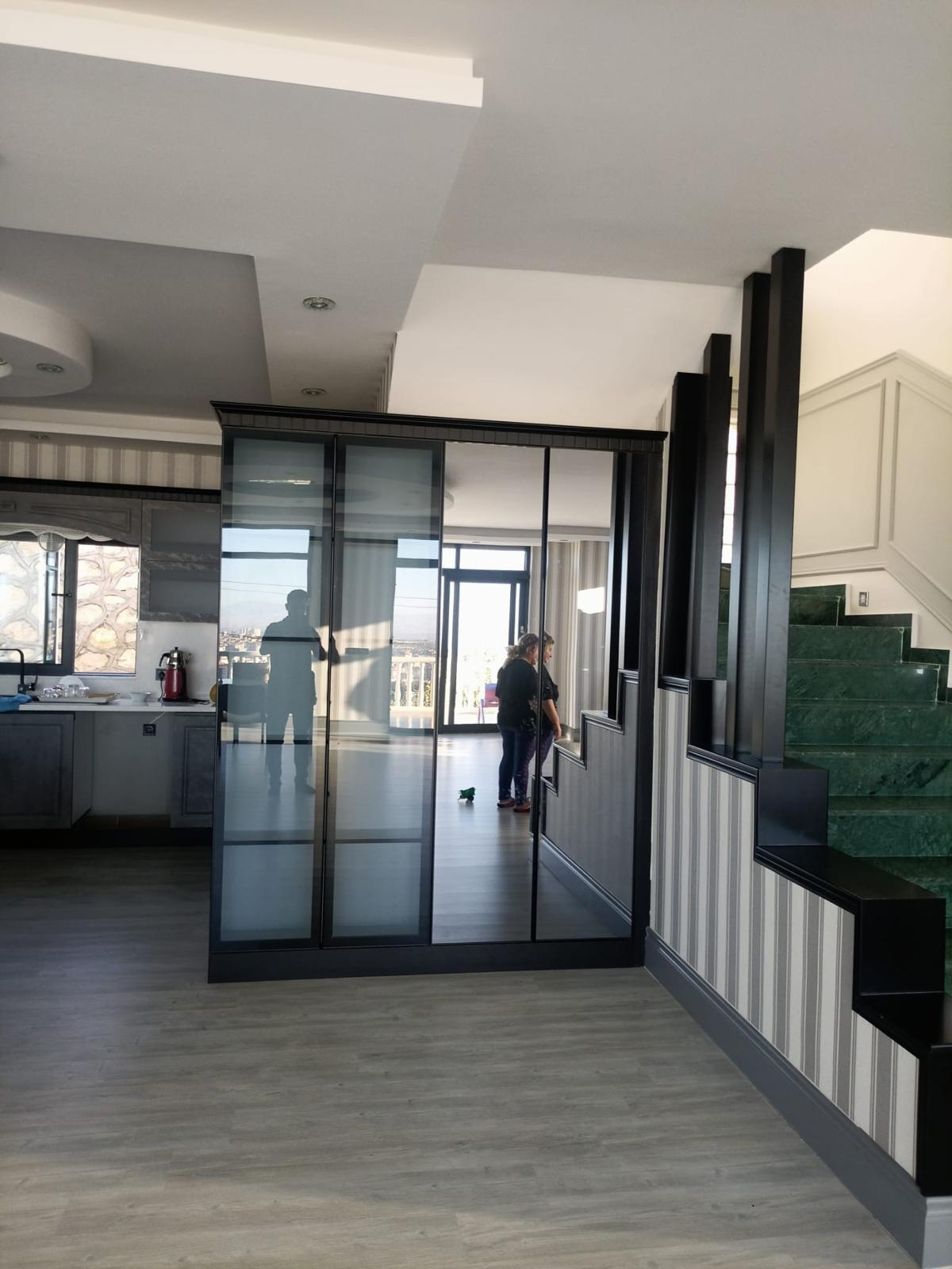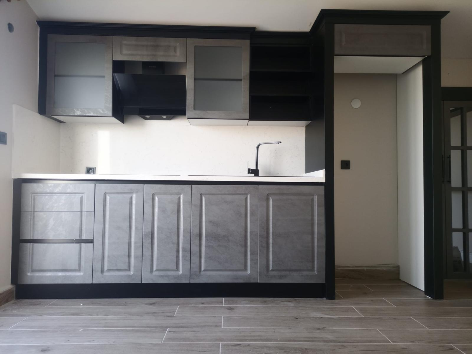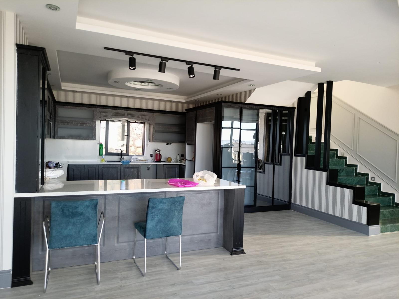 A bold, modern kitchen featuring textured concrete-finish cabinetry paired with deep matte black framing. This design includes a spacious waterfall-edge peninsula, integrated track lighting, and frosted glass uppers for a clean, industrial aesthetic. Engineered for the modern Tampa home, it maximizes storage with a floor-to-ceiling pantry and seamless appliance integration.